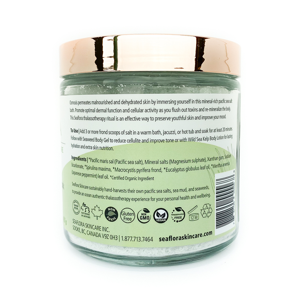 Breathe deeply and decongest your mind and body. Experience the luxury of Japanese Peppermint and Eucalyptus as organic hand-harvested sea kelp provides your skin with bountiful ocean-rich nutrients. Nothing says relaxation like our Japanese Peppermint Eucalyptus Sea Salt Soak. As always made with hand-harvested West Coast kelp. All the ingredients in this formula are food-grade and/or certified organic. Vegan, cruelty-free, gluten-free, 100% Non-GMO.